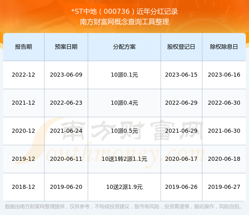 *ST中地最新一次公布的分紅方案為10派0.1元。本次權益分派股權登記日為2023年6月15日,除權除息日為2023年6月16日,派息日為2023年6月16日。
