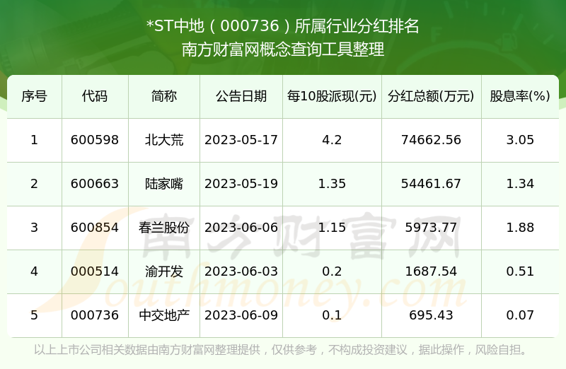 按照南方財富網(wǎng)趨勢選股系統(tǒng)統(tǒng)計,*ST中地所屬行業(yè)為房地產(chǎn)行業(yè),房地產(chǎn)行業(yè)分紅排名情況如下表: