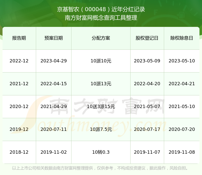 京基智農(nóng)最新一次公布的分紅方案為10派10元。本次權(quán)益分派股權(quán)登記日為2023年5月9日,除權(quán)除息日為2023年5月10日,派息日為2023年5月10日。
