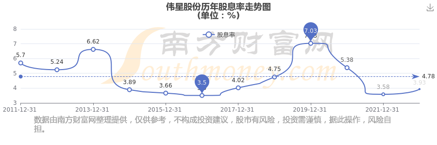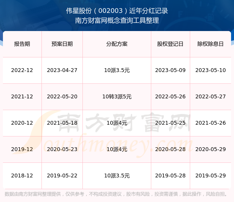 偉星股份最新一次公布的分紅方案為10派3.5元。本次權(quán)益分派股權(quán)登記日為2023年5月9日,除權(quán)除息日為2023年5月10日,派息日為2023年5月10日。