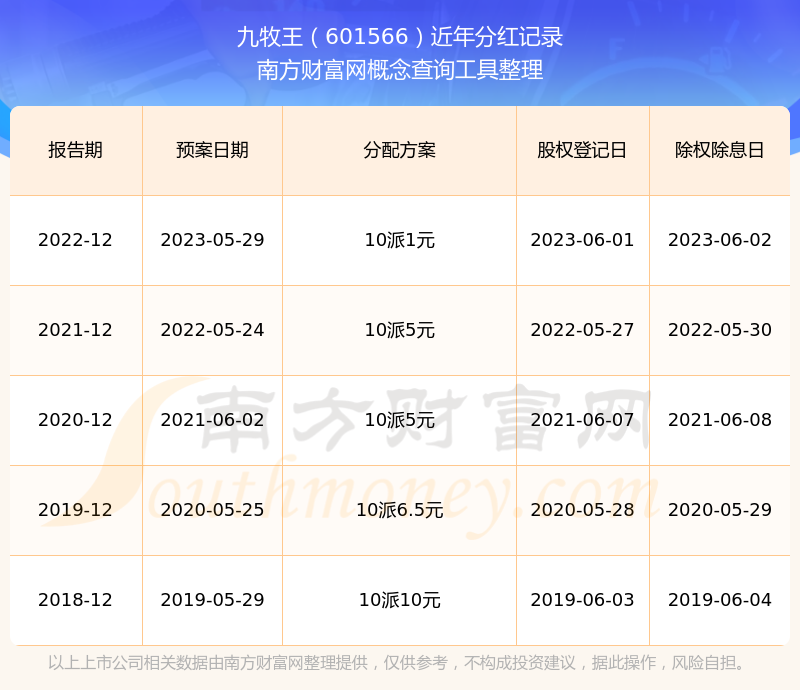 九牧王最新一次公布的分紅方案為10派1元。本次權(quán)益分派股權(quán)登記日為2023年6月1日,除權(quán)除息日為2023年6月2日,派息日為2023年6月2日。