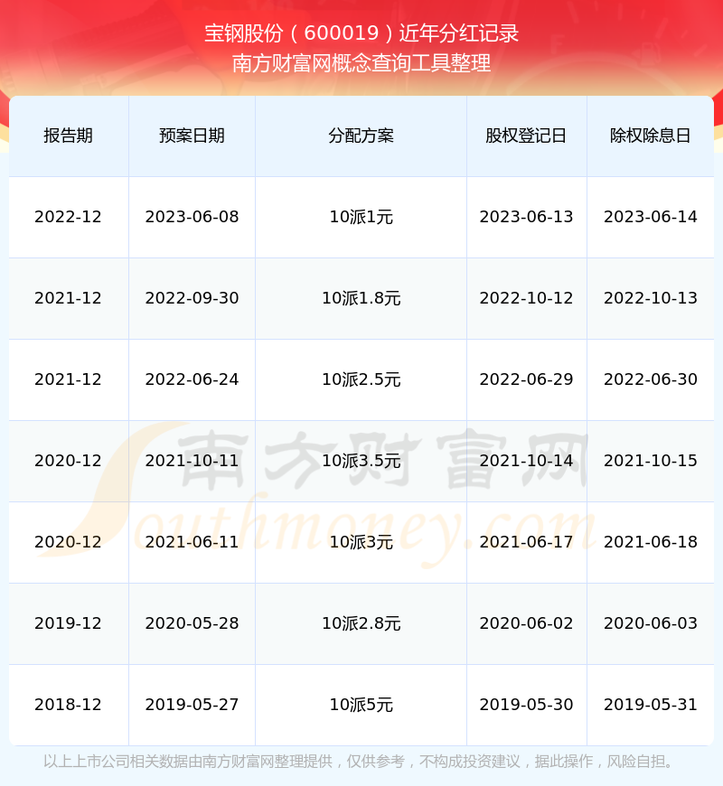 寶鋼股份最新一次公布的分紅方案為10派1元。本次權(quán)益分派股權(quán)登記日為2023年6月13日,除權(quán)除息日為2023年6月14日,派息日為2023年6月14日。