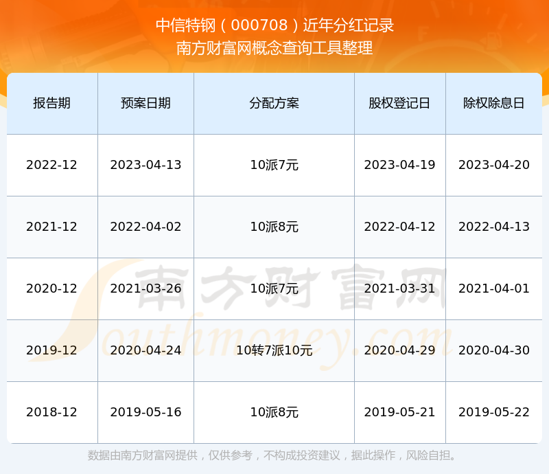 中信特鋼最新一次公布的分紅方案:10派7元。