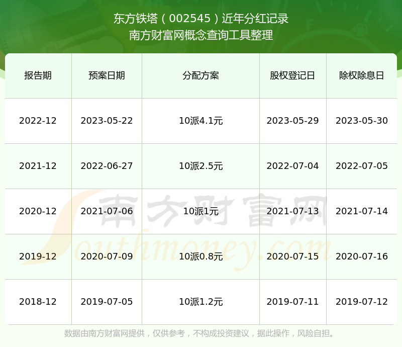 東方鐵塔最新一次公布的分紅方案為10派4.1元。本次權(quán)益分派股權(quán)登記日為2023年5月29日,除權(quán)除息日為2023年5月30日,派息日為2023年5月30日。