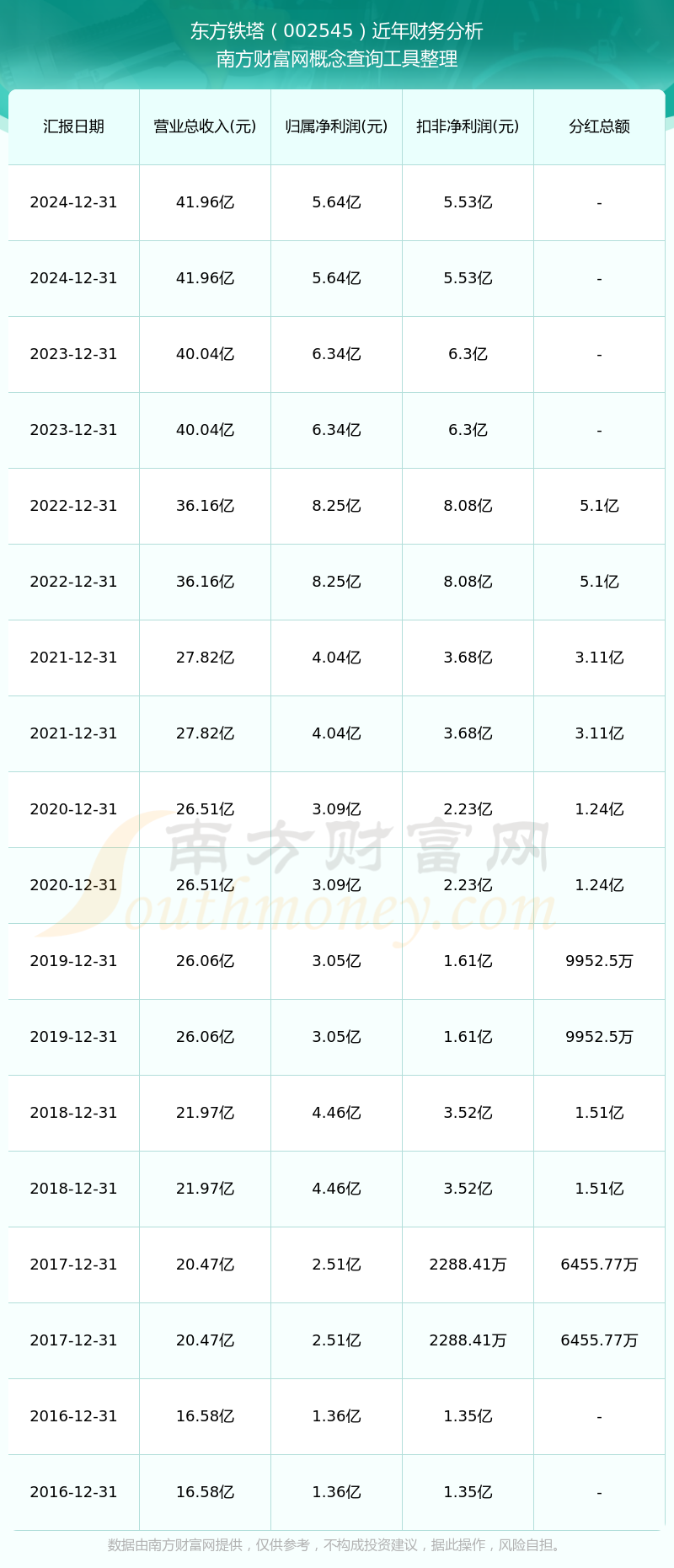 近年東方鐵塔分紅派息情況如下表所示: