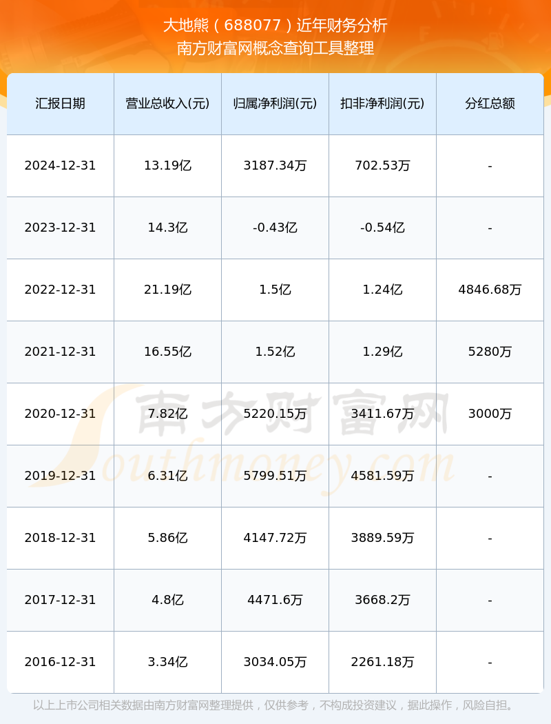 2024年大地熊總營(yíng)收13.19億,同比增長(zhǎng)-7.79%;凈利潤(rùn)3187.34萬(wàn),同比增長(zhǎng)174.46%;銷(xiāo)售毛利率15.8%。