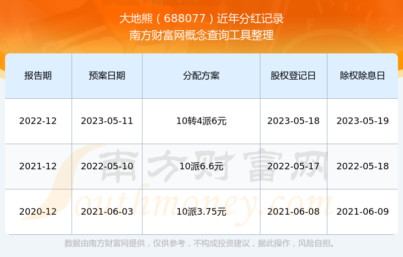 大地熊最新一次公布的分紅方案為10轉(zhuǎn)4派6元。本次權(quán)益分派股權(quán)登記日為2023年5月18日,除權(quán)除息日為2023年5月19日,派息日為2023年5月19日。