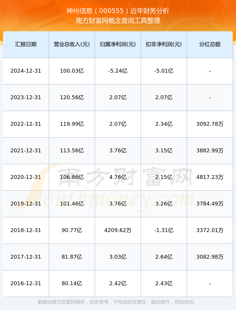 2024年報(bào)顯示,神州信息實(shí)現(xiàn)營收100.03億,同比增長-17.03%;凈利潤-5.24億,同比增長-353.01%;毛利率14.94%。