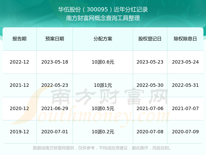 華伍股份最新一次公布的分紅方案為10派0.6元。本次權(quán)益分派股權(quán)登記日為2023年5月23日,除權(quán)除息日為2023年5月24日,派息日為2023年5月24日。