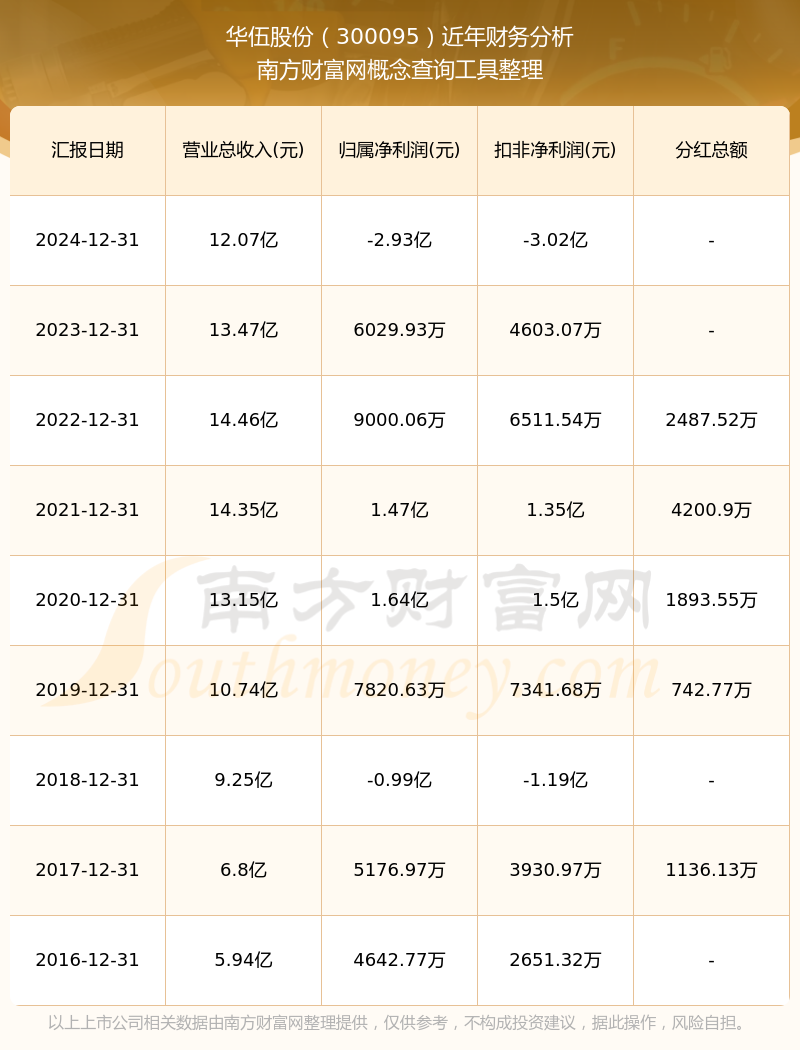 2024年華伍股份總營(yíng)收12.07億,同比增長(zhǎng)-10.42%;凈利潤(rùn)-2.93億,同比增長(zhǎng)-585.32%;銷售毛利率18.06%。