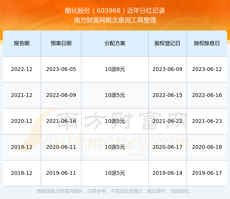 醋化股份最新一次公布的分紅方案為10派8元。本次權(quán)益分派股權(quán)登記日為2023年6月9日,除權(quán)除息日為2023年6月12日,派息日為2023年6月12日。