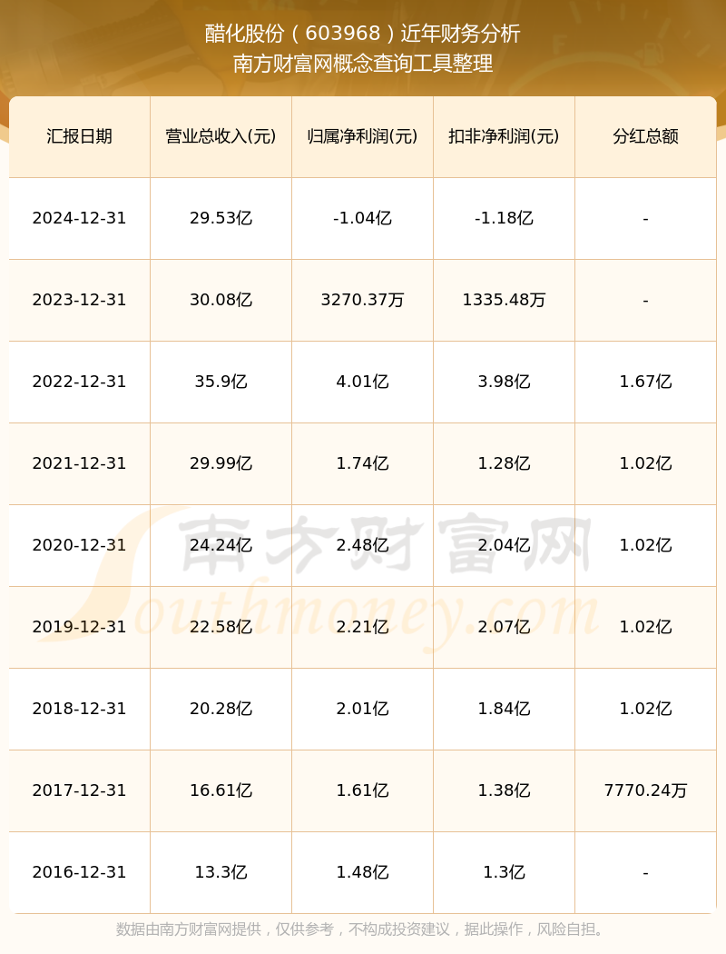 2024年醋化股份總營收29.53億,同比增長-1.83%;凈利潤-1.04億,同比增長-417.46%;銷售毛利率8.66%。