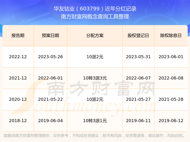 華友鈷業(yè)最新一次公布的分紅方案為10派2元。本次權(quán)益分派股權(quán)登記日為2023年5月31日,除權(quán)除息日為2023年6月1日,派息日為2023年6月1日。