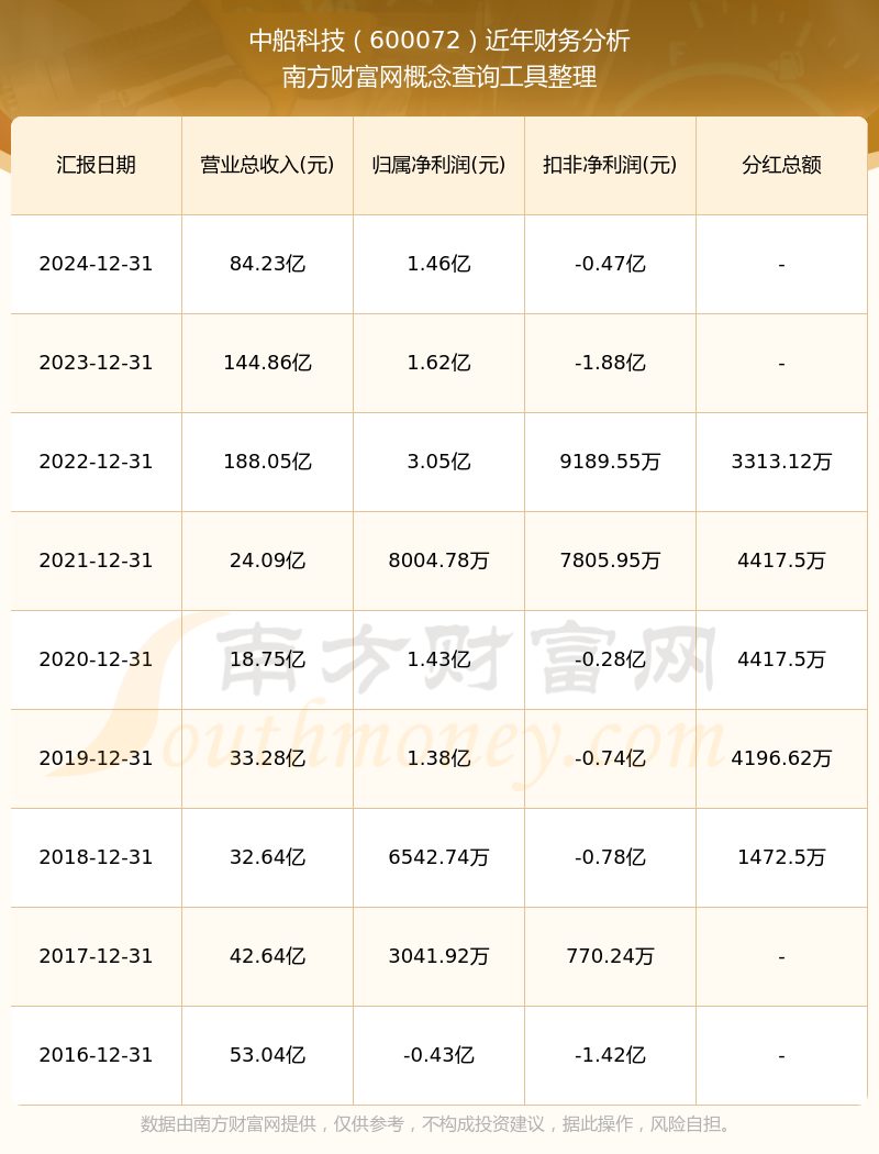 中船科技公司2024年實現(xiàn)營業(yè)收入84.23億元,同比增長-41.85%;凈利潤1.46億元,同比增長-9.51%;毛利率7.6%。
