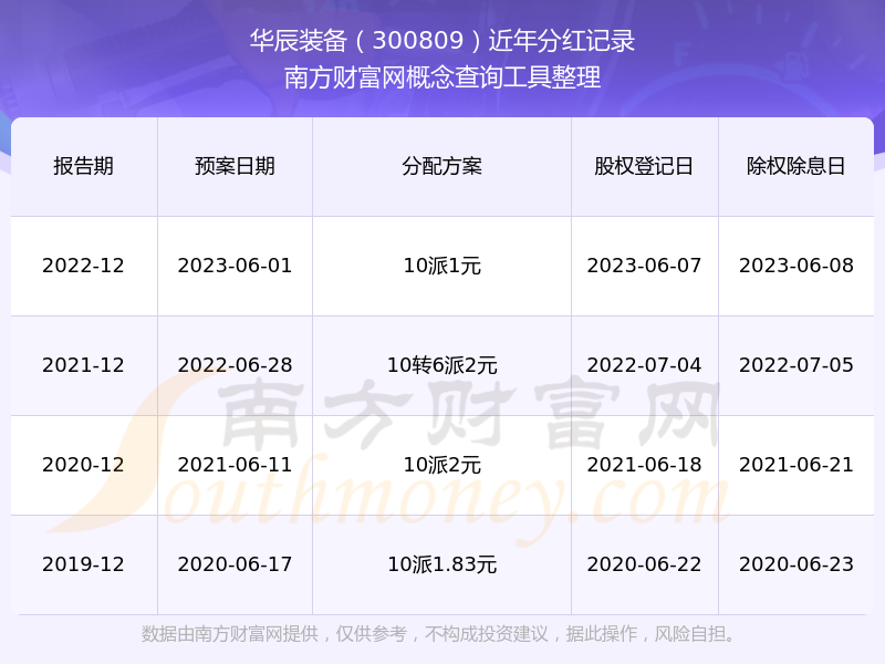 華辰裝備最新一次公布的分紅方案為10派1元。本次權(quán)益分派股權(quán)登記日為2023年6月7日,除權(quán)除息日為2023年6月8日,派息日為2023年6月8日。