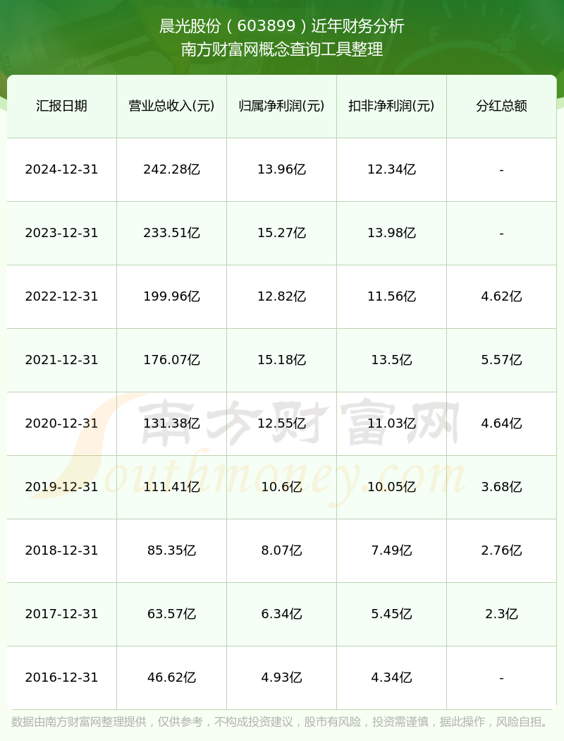 晨光股份公司2024年實(shí)現(xiàn)營業(yè)收入242.28億元,同比增長3.76%;凈利潤13.96億元,同比增長-8.58%;毛利率18.9%。