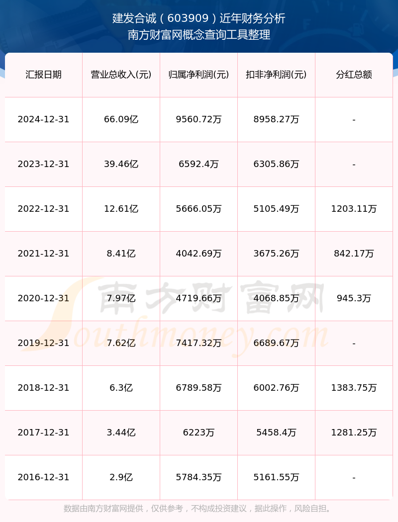 建發(fā)合誠2024年總營收66.09億,同比增長67.49%;凈利潤9560.72萬,同比增長45.03%;銷售毛利率5.95%。