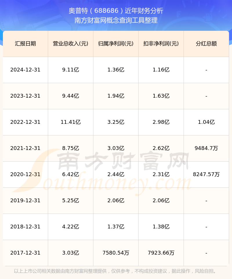 奧普特公司2024年實(shí)現(xiàn)營(yíng)業(yè)收入9.11億元,同比增長(zhǎng)-3.44%;凈利潤(rùn)1.36億元,同比增長(zhǎng)-29.66%;毛利率63.57%。