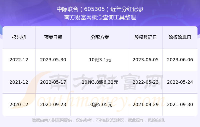 中際聯(lián)合最新一次公布的分紅方案為10派3.1元。本次權(quán)益分派股權(quán)登記日為2023年6月5日,除權(quán)除息日為2023年6月6日,派息日為2023年6月6日。