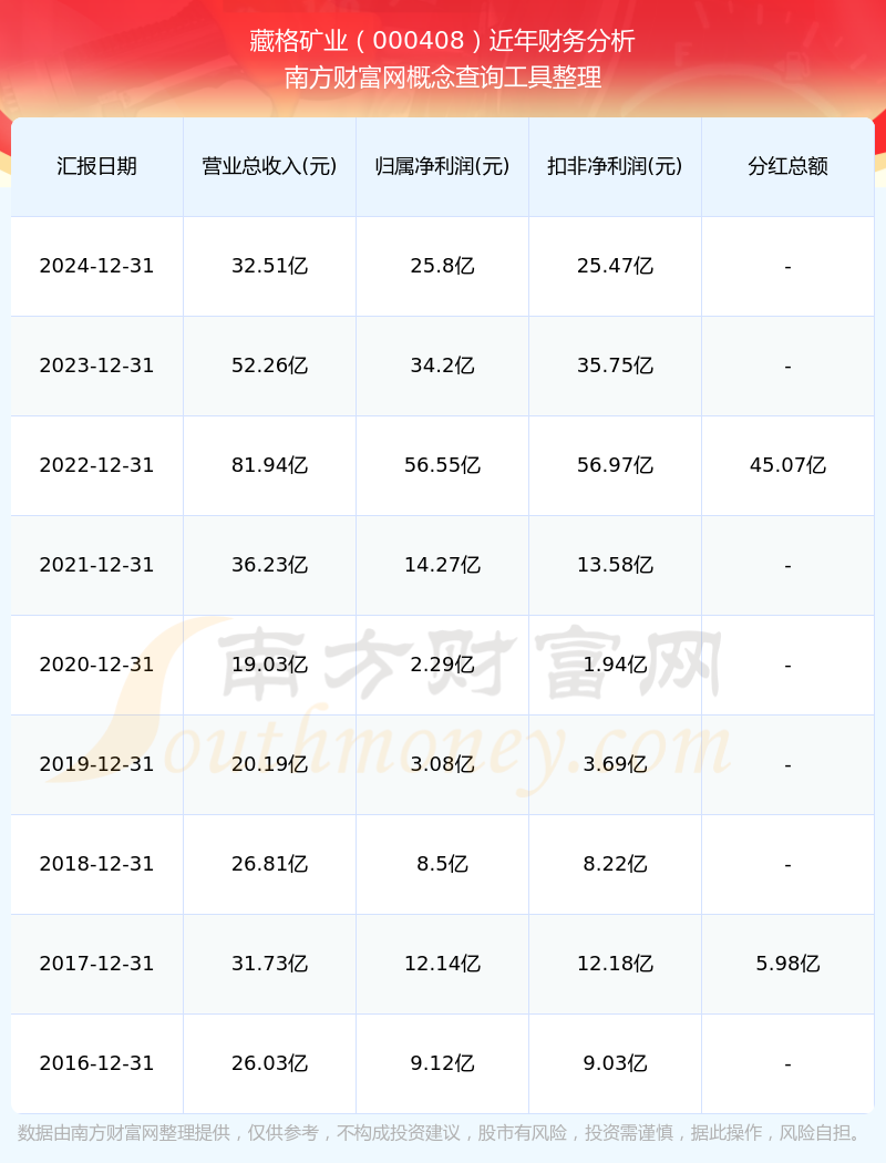 藏格礦業(yè)2024年總營收32.51億,同比增長-37.79%;凈利潤25.8億,同比增長-24.56%;銷售毛利率44.91%。