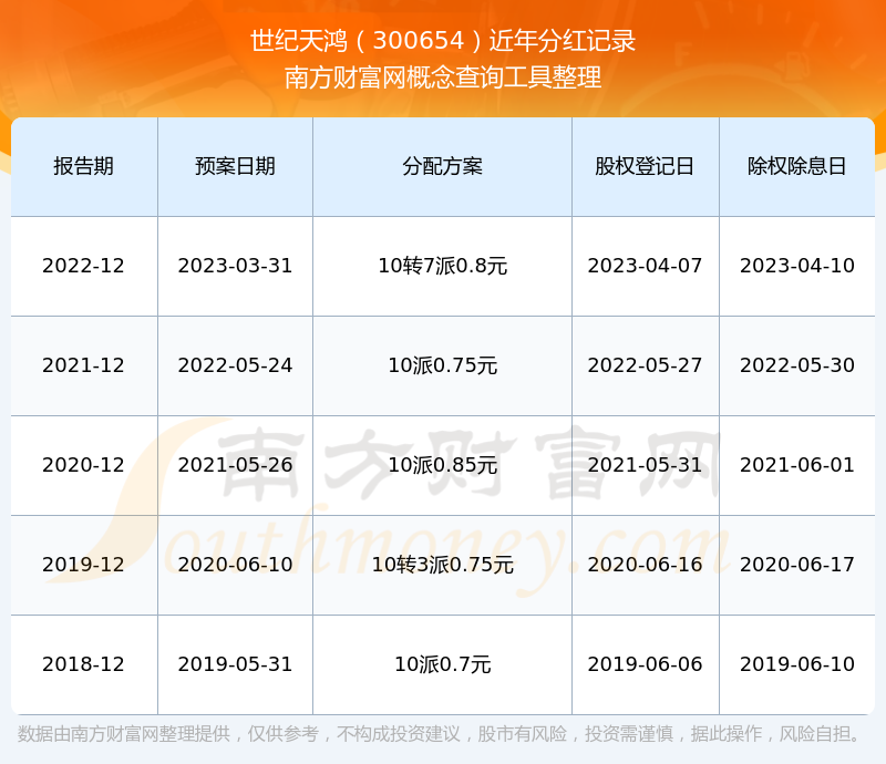 世紀(jì)天鴻歷年分紅派息情況如下表所示: