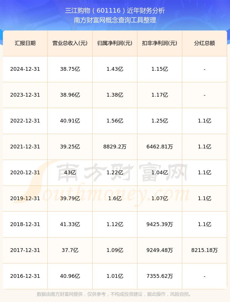 2024年三江購物總營收38.75億,同比增長-0.53%;凈利潤1.43億,同比增長3.51%;銷售毛利率26.83%。
