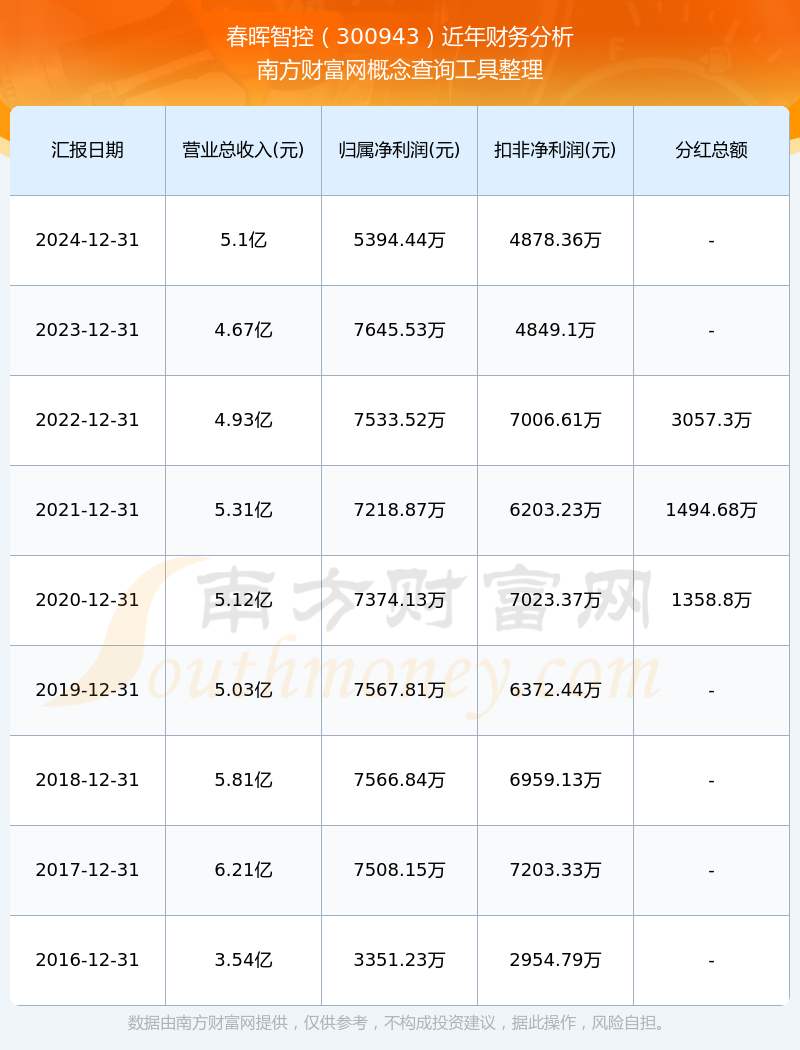 2024年春暉智控總營收5.1億,同比增長9.25%;凈利潤5394.44萬,同比增長-29.44%;銷售毛利率26.39%。