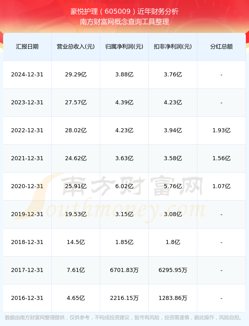 豪悅護(hù)理2024年總營收29.29億,同比增長6.25%;凈利潤3.88億,同比增長-11.65%;銷售毛利率27.91%。