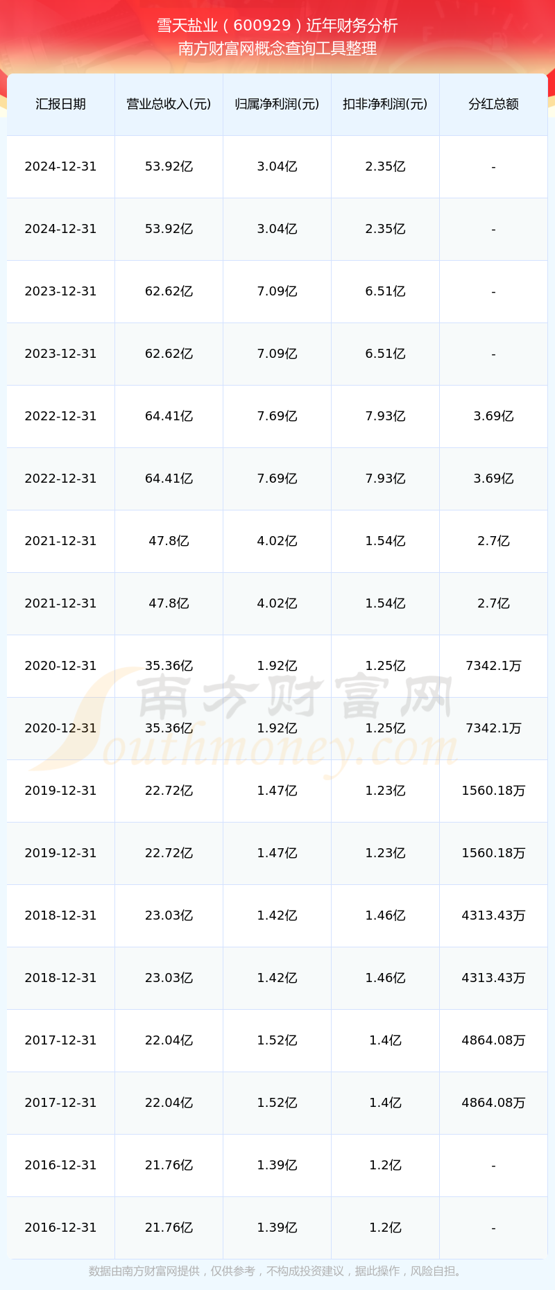 近年雪天鹽業(yè)分紅派息情況如下表所示: