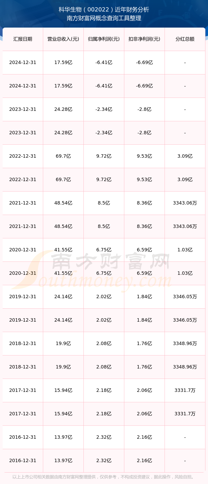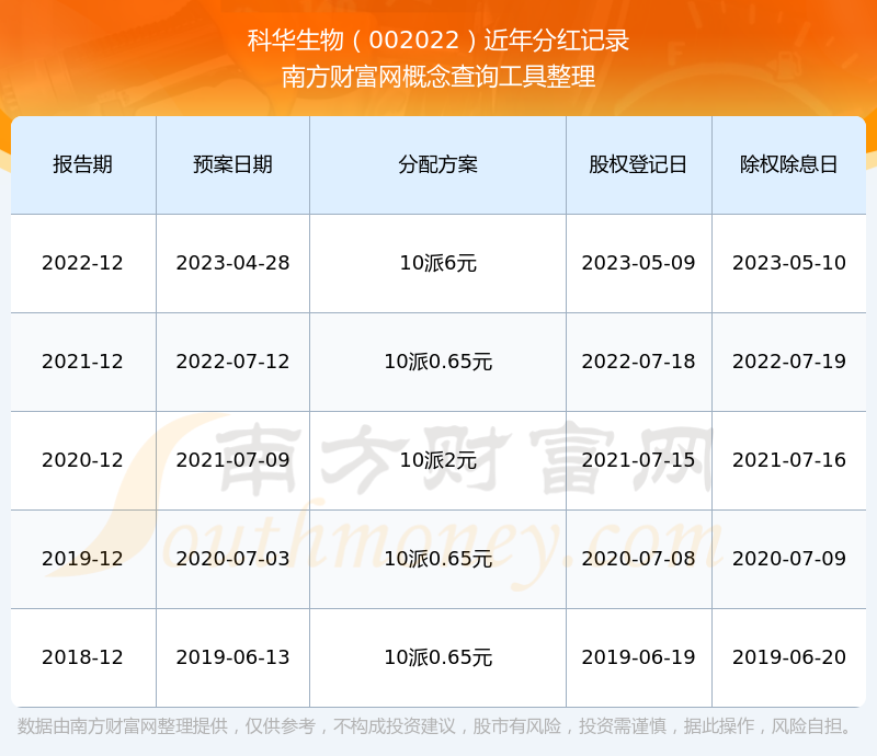 科華生物最新一次公布的分紅方案為10派6元。本次權(quán)益分派股權(quán)登記日為2023年5月9日,除權(quán)除息日為2023年5月10日,派息日為2023年5月10日。