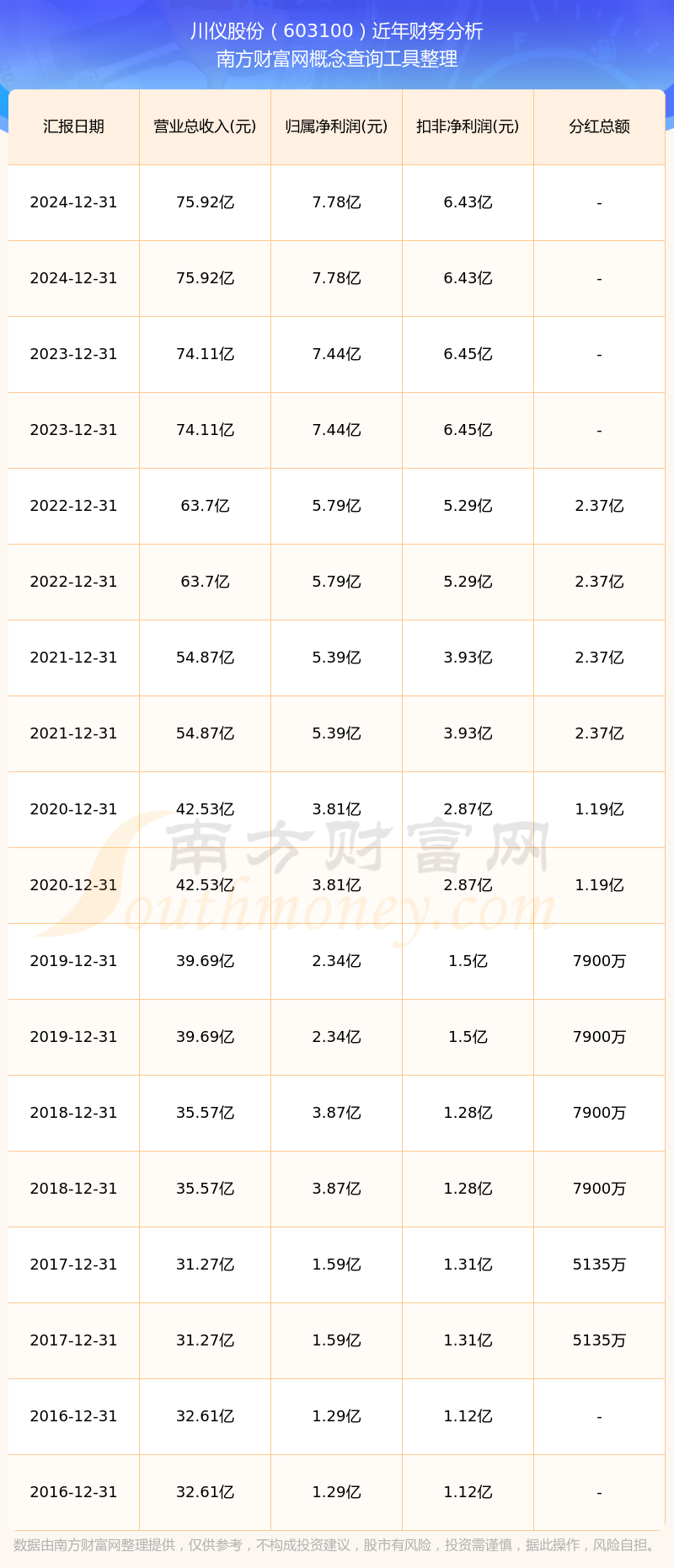 川儀股份2024年總營收75.92億,同比增長2.44%;凈利潤7.78億,同比增長4.6%;銷售毛利率33.09%。