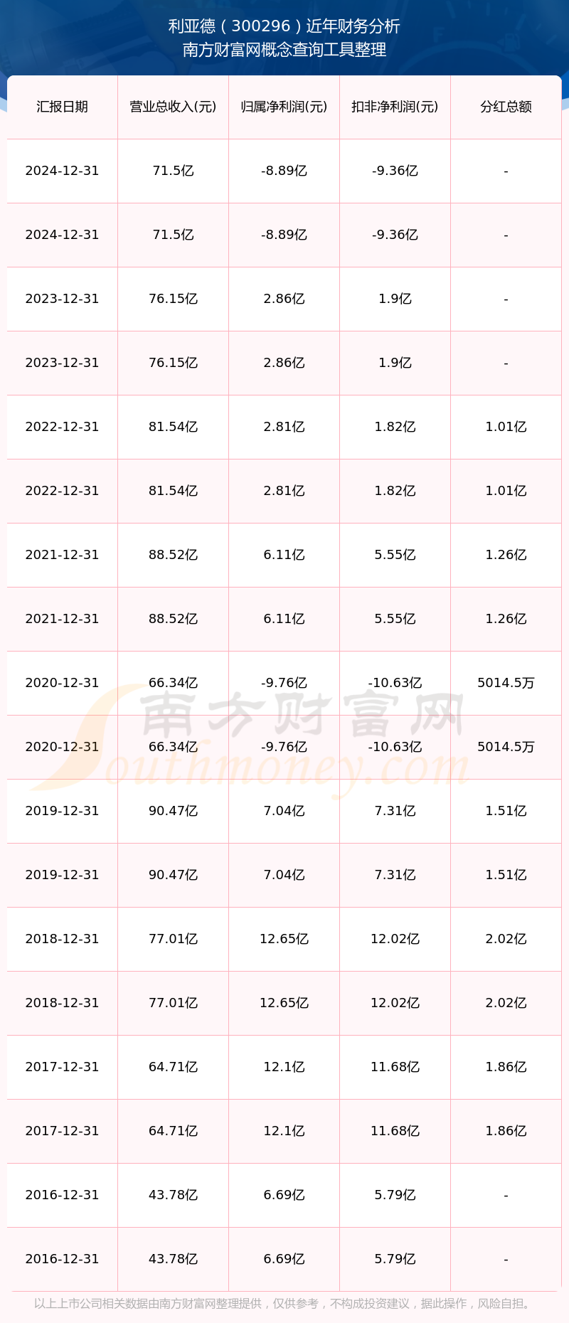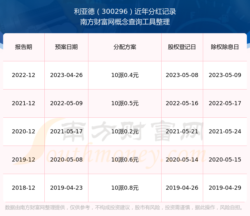 利亞德歷年分紅派息情況如下表所示: