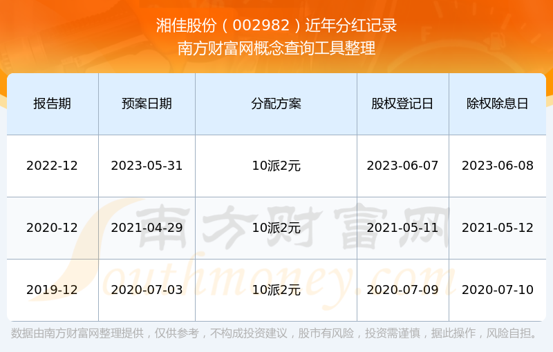 湘佳股份最新一次公布的分紅方案:10派2元。