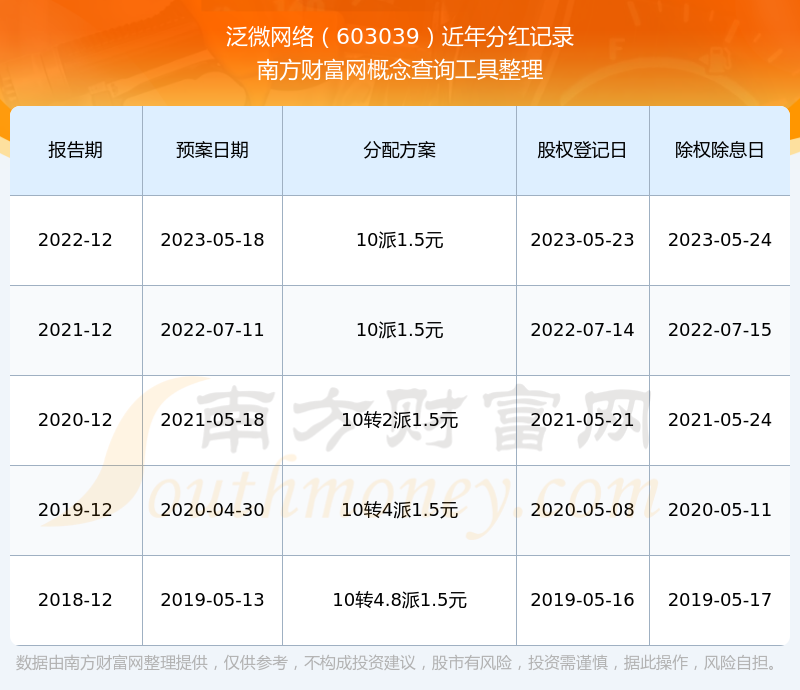 泛微網(wǎng)絡(luò)最新一次公布的分紅方案為10派1.5元。本次權(quán)益分派股權(quán)登記日為2023年5月23日,除權(quán)除息日為2023年5月24日,派息日為2023年5月24日。