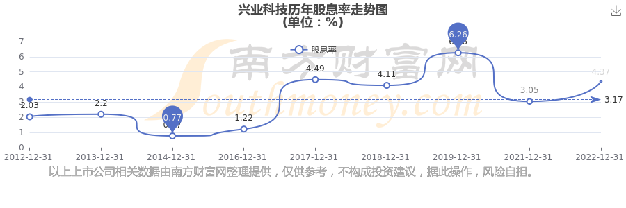 興業(yè)科技?xì)v年股息率走勢(shì)如下圖: