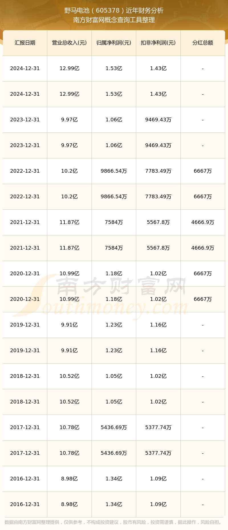 野馬電池歷年分紅派息情況如下表所示: