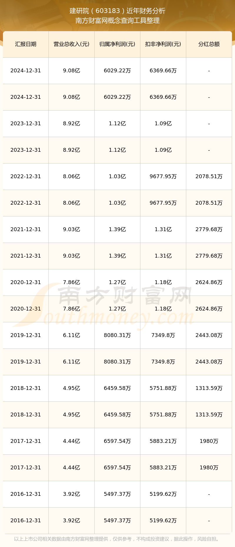 建研院2024年總營收9.08億,同比增長1.71%;凈利潤6029.22萬,同比增長-46.23%;銷售毛利率48.43%。