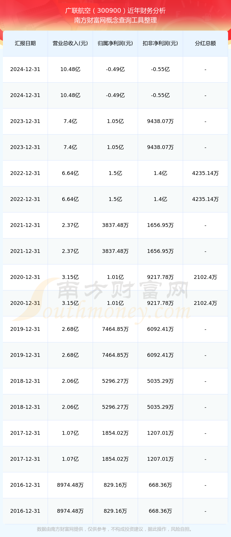 廣聯(lián)航空公司2024年實(shí)現(xiàn)營收10.48億元,凈利潤-4909.78萬元,毛利率28.95%。