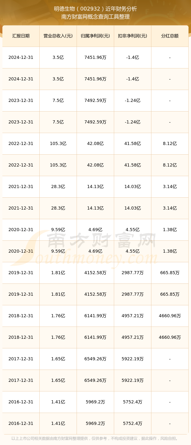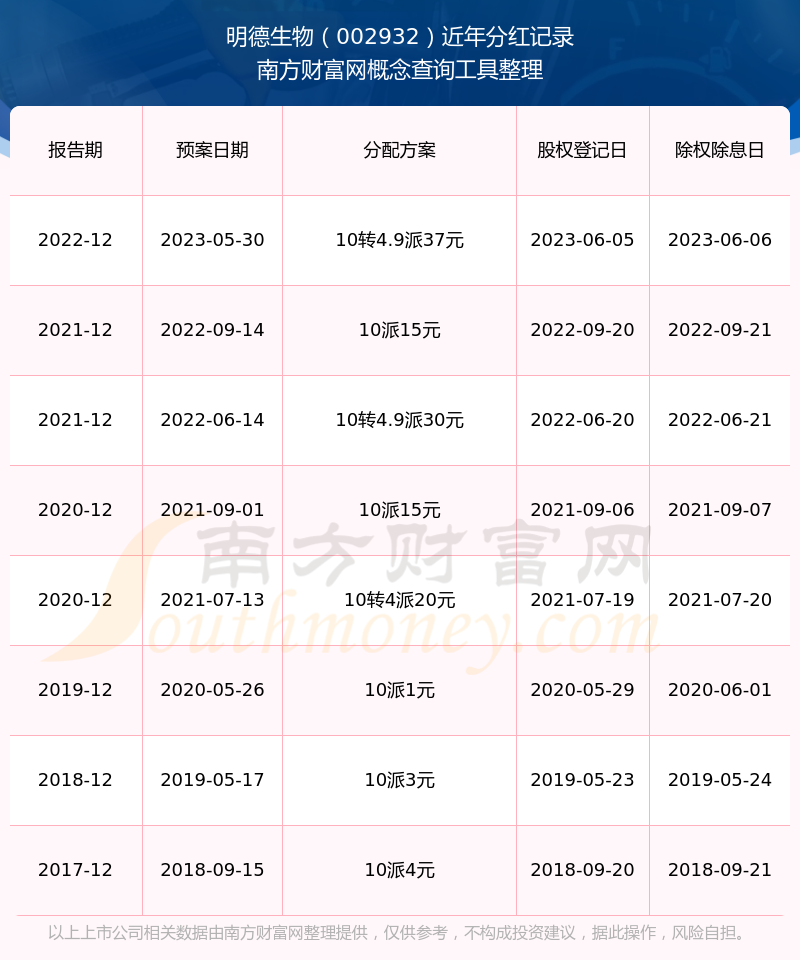 明德生物歷年分紅派息情況如下表所示: