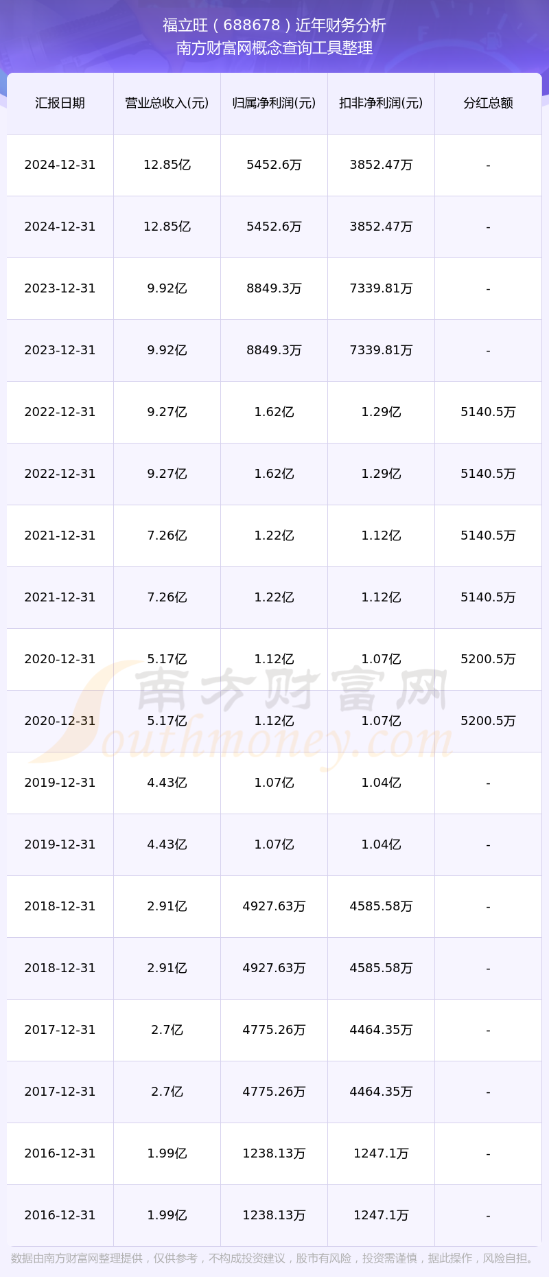 福立旺歷年分紅派息情況如下表所示: