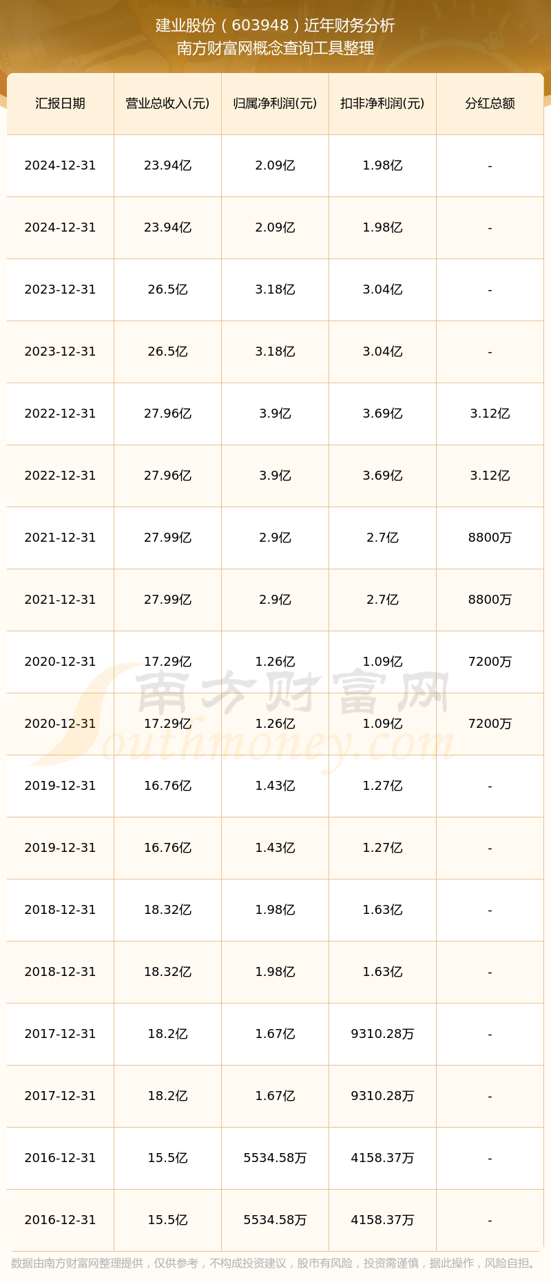 建業(yè)股份公司2024年實(shí)現(xiàn)營(yíng)業(yè)收入23.94億元,同比增長(zhǎng)-9.64%;凈利潤(rùn)2.09億元,同比增長(zhǎng)-34.19%;毛利率13.77%。