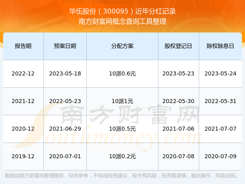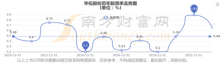 華伍股份最新一次公布的分紅方案為10派0.6元。本次權(quán)益分派股權(quán)登記日為2023年5月23日,除權(quán)除息日為2023年5月24日,派息日為2023年5月24日。
