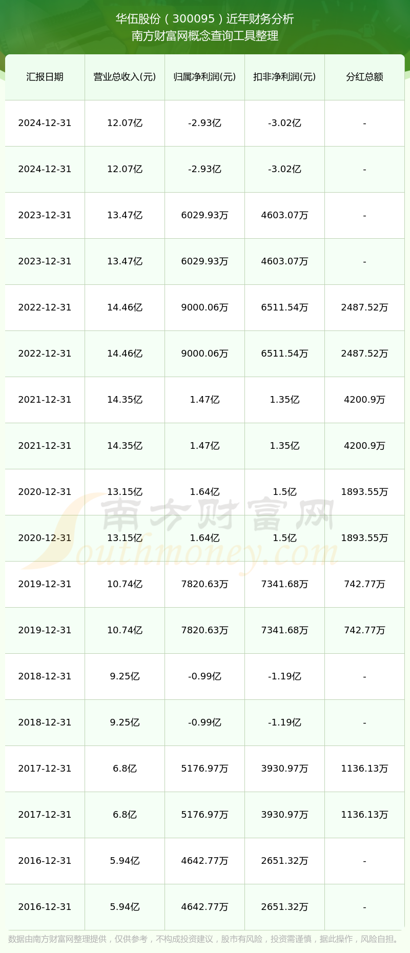 華伍股份2024年總營收12.07億,同比增長-10.42%;凈利潤-2.93億,同比增長-585.32%;銷售毛利率18.06%。