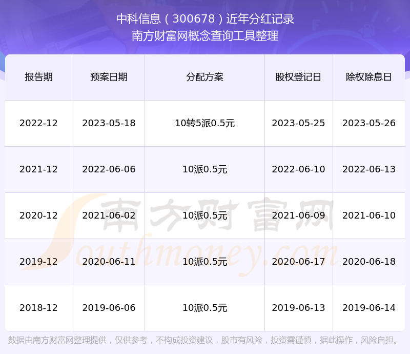 中科信息最新一次公布的分紅方案:10轉(zhuǎn)5派0.5元。