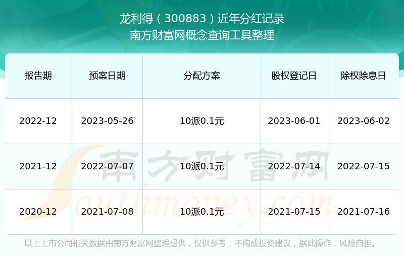 龍利得最新一次公布的分紅方案為10派0.1元。本次權(quán)益分派股權(quán)登記日為2023年6月1日,除權(quán)除息日為2023年6月2日,派息日為2023年6月2日。