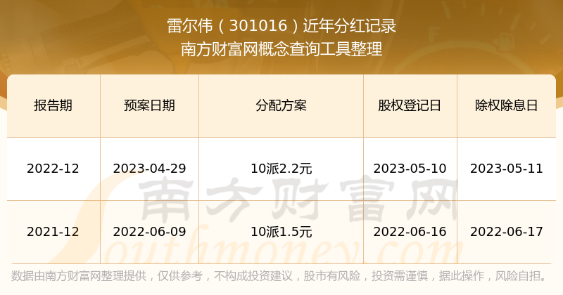 雷爾偉最新一次公布的分紅方案為10派2.2元。本次權益分派股權登記日為2023年5月10日,除權除息日為2023年5月11日,派息日為2023年5月11日。
