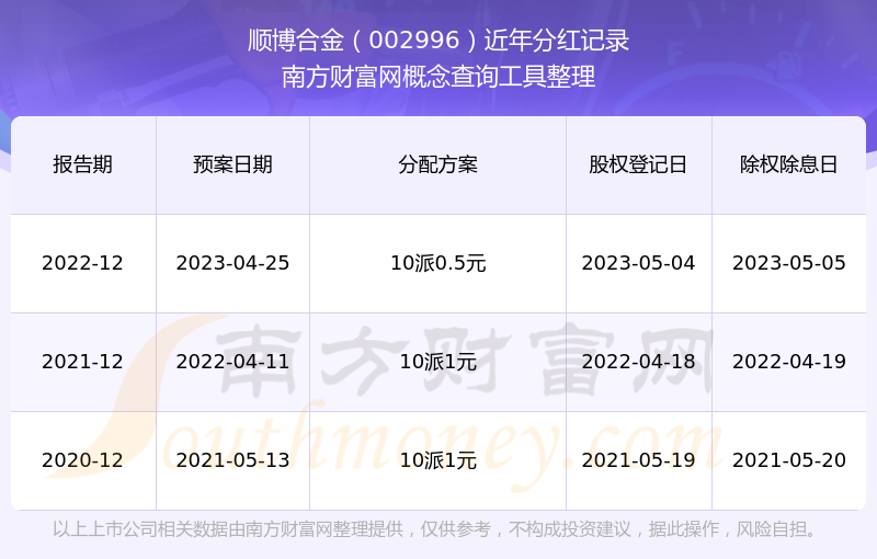 順博合金最新一次公布的分紅方案為10派0.5元。本次權益分派股權登記日為2023年5月4日,除權除息日為2023年5月5日,派息日為2023年5月5日。