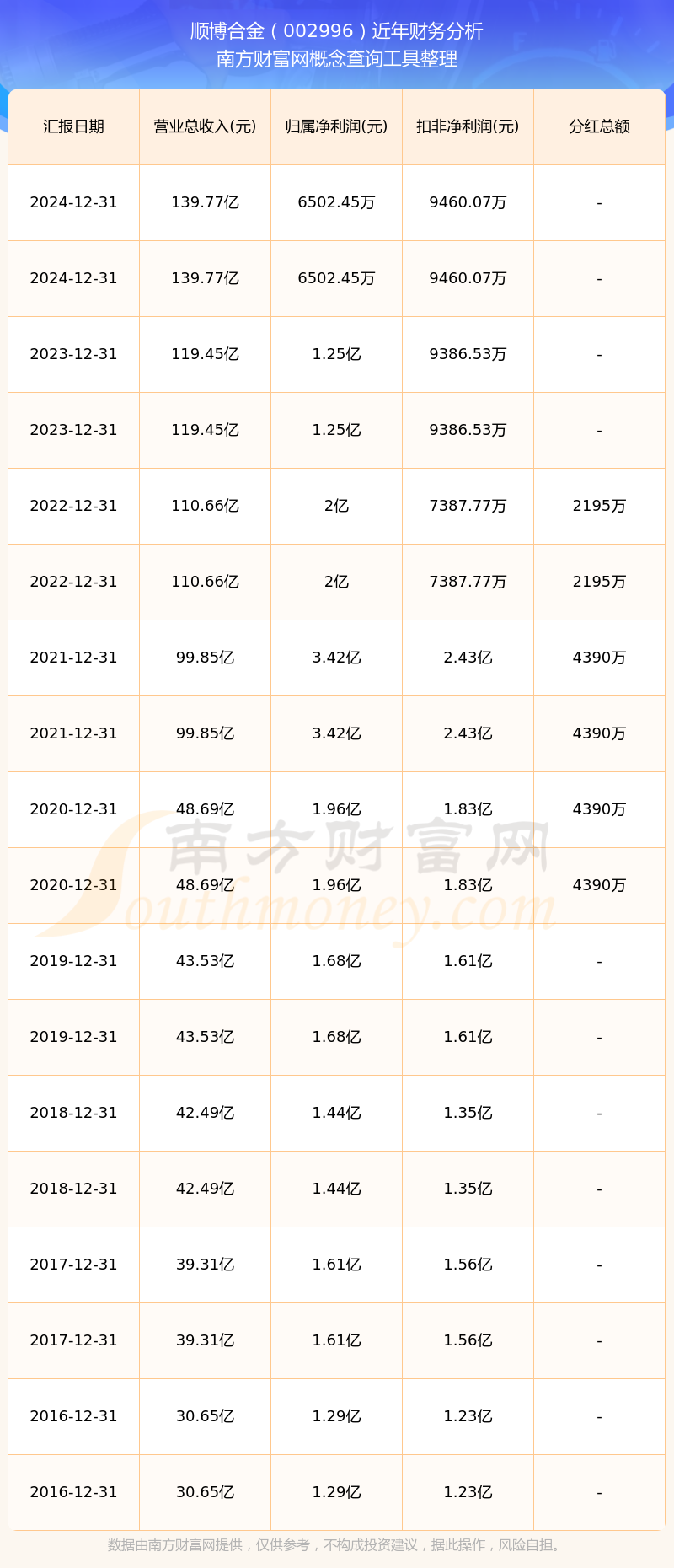 順博合金歷年分紅派息情況如下表所示: