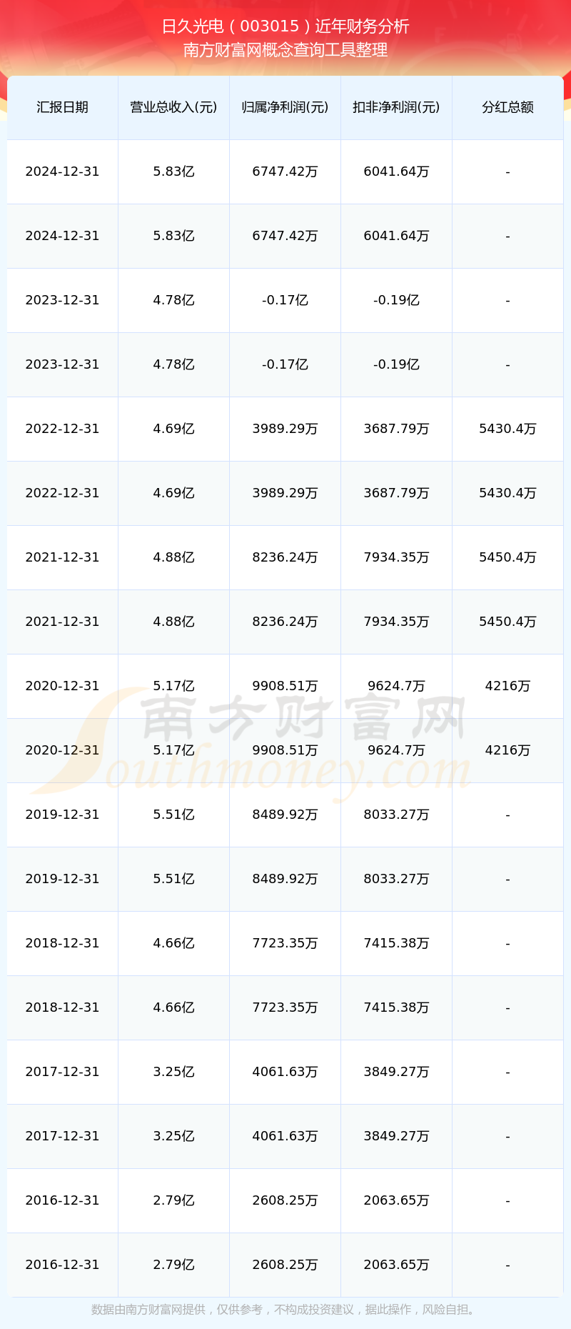 近年日久光電分紅派息情況如下表所示: