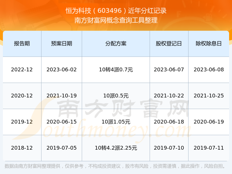 恒為科技最新一次公布的分紅方案為10轉4派0.7元。本次權益分派股權登記日為2023年6月7日,除權除息日為2023年6月8日,派息日為2023年6月8日。